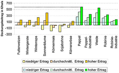 Die Erträge schwanken von 5-20 to(atro)/ha und Jahr.