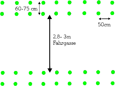 Der Reihenabstand sollte vom gewünschten Ernteverfahren und der Umtriebszeit gewählt werden: